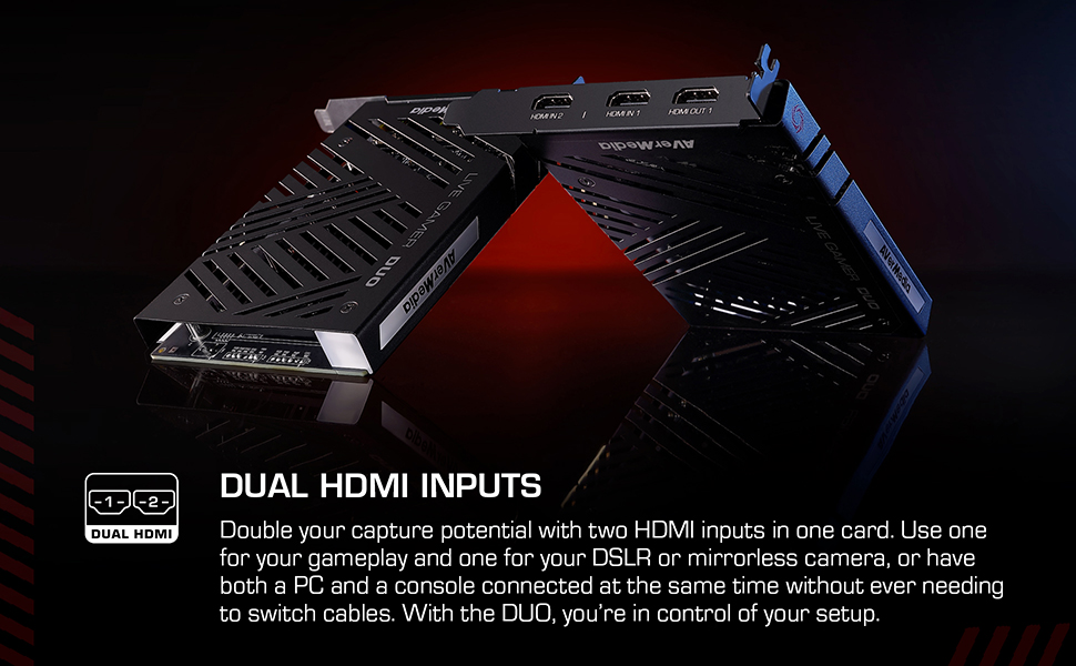 The features of the AVerMedia Live Gamer DUO at a glance: – PCIe capture card with two HDMI inputs – An HDMI output for looping through – Recording in Full HD with HDR at 60 FPS – Loop through in 4K with HDR at 60 FPS – Highly efficient recordings with H.265 codec – RGB-LED lighting with 16.7 million colors – Onboard video processing and compression – Suitable for various streaming software |